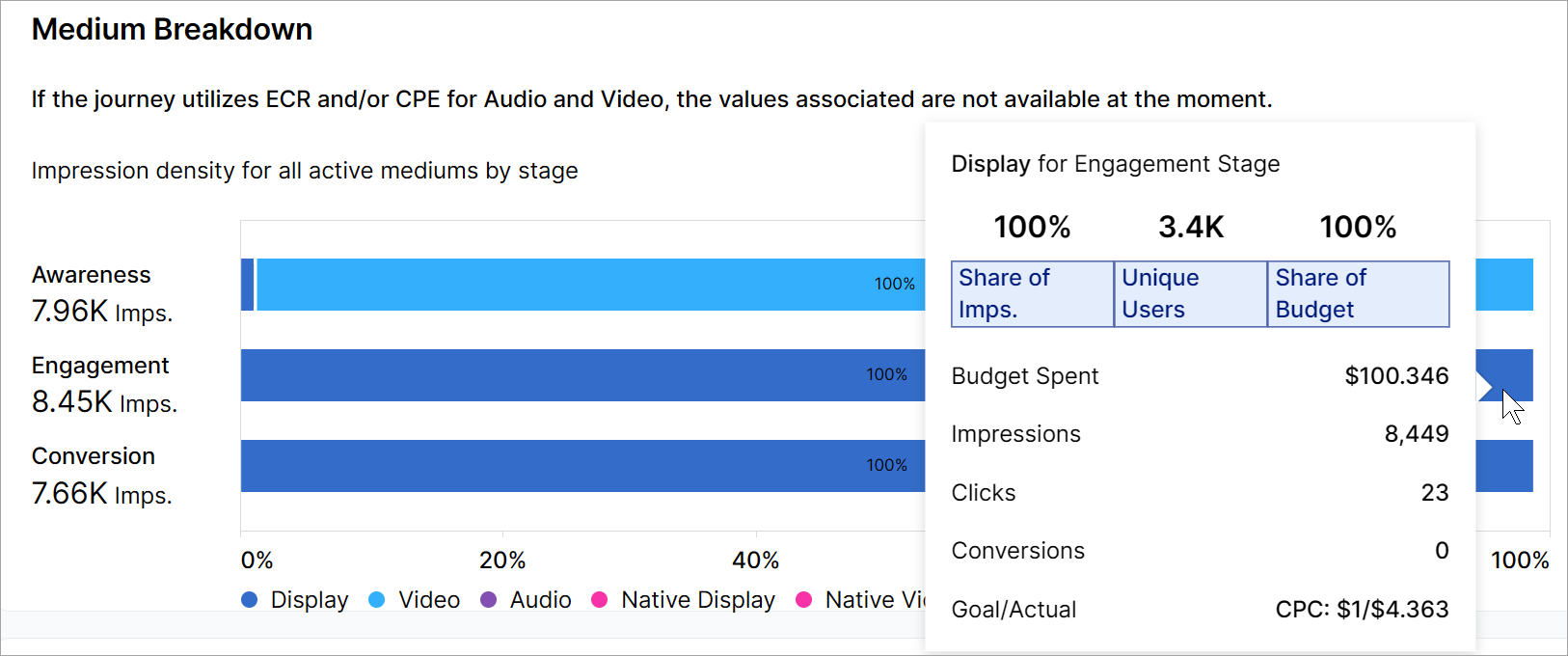 Get impression density details for each creative type in the campaign. Hover a colored section of the bar to display stage details.
