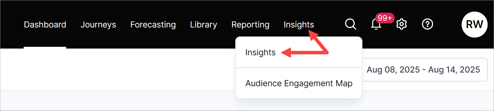 Log in to illumin and select an account. Click Insights on the menu bar and then select Insights on the drop-down.