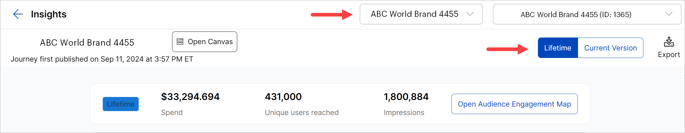 Choose the Insights option to get visually strong displays of Journey Canvas campaign performance. Note this tool is not available on Classic Canvas.