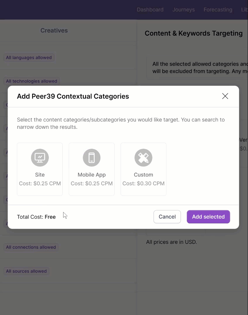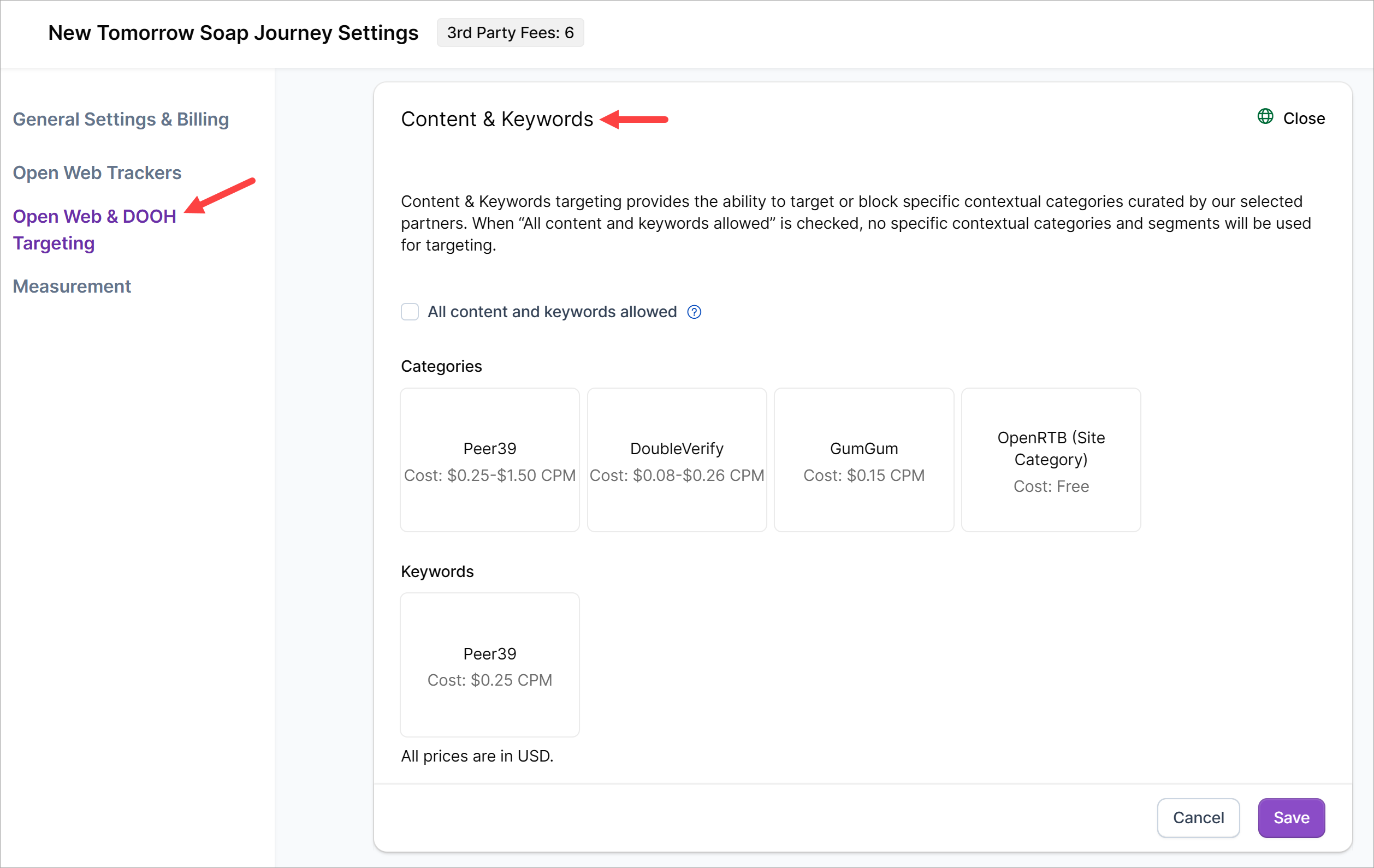 There are four options to enable category targeting. Enable these filters to add or block targeting keywords, channels, and contextual categories.