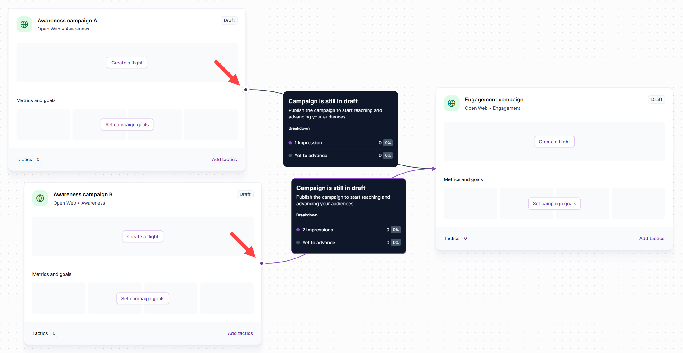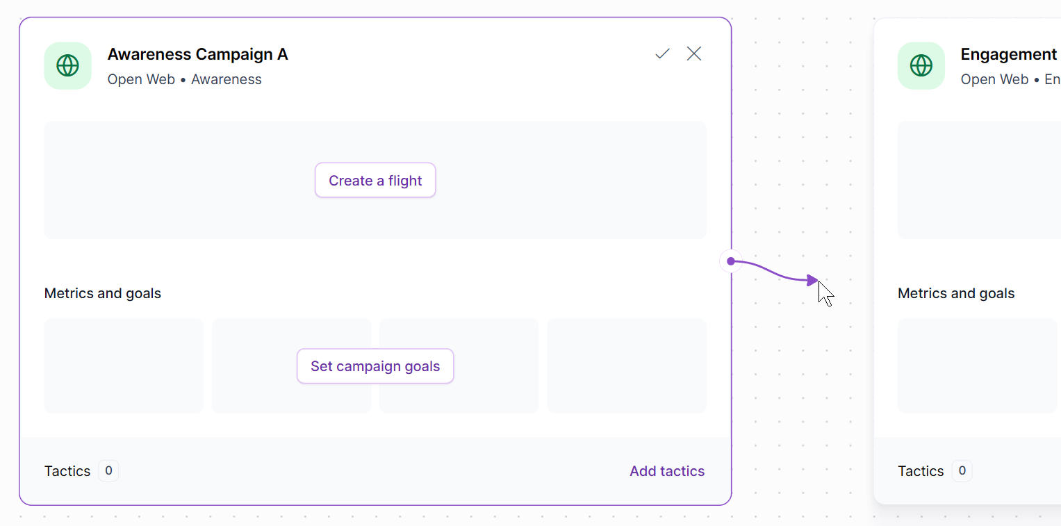 Next, click the icon and drag the line to the destination campaign block. The line auto-snaps to the block. However, the line won't snap to an ineligible campaign block (e.g. DOOH).