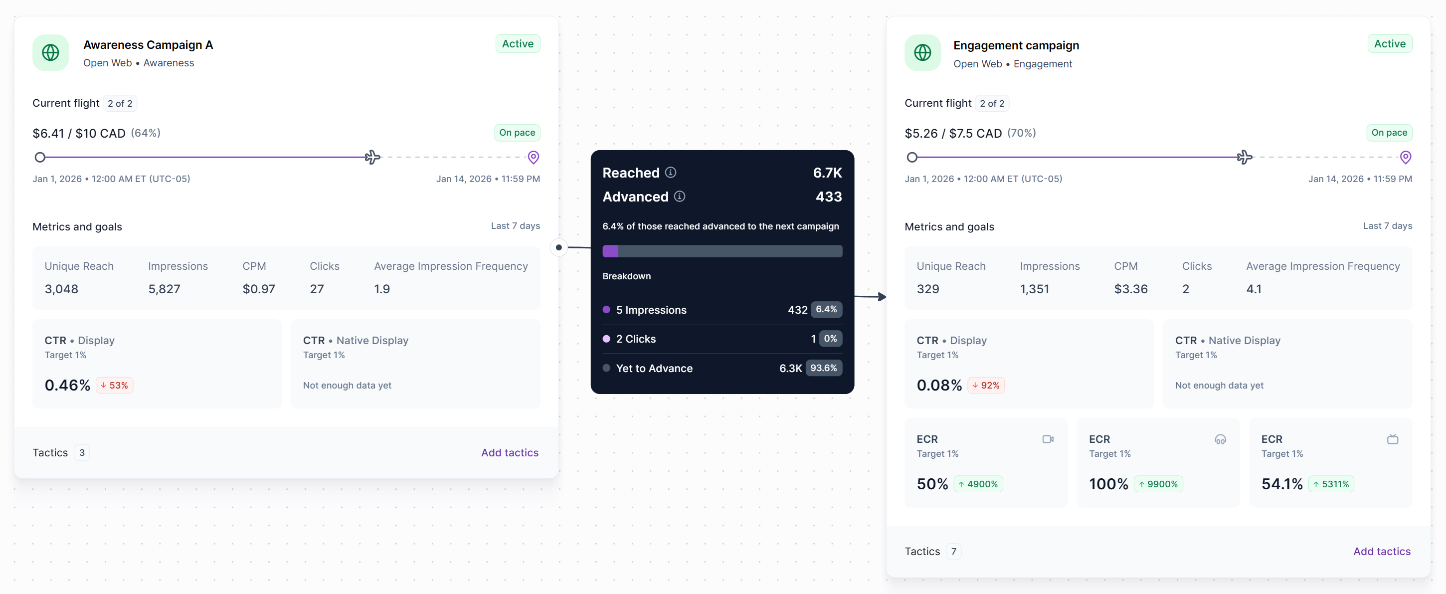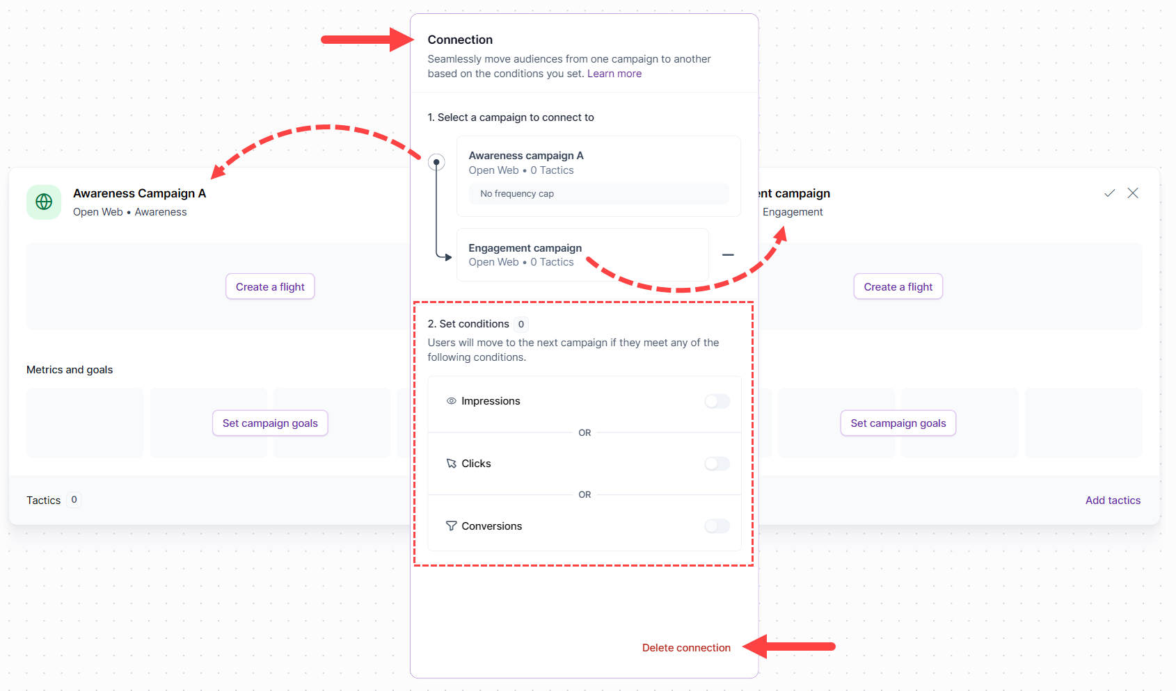 A connection is a bridge between two or more campaign blocks. It also acts as a filter. Audiences move forward in the funnel only when they meet defined criteria, which are called conditions, such as reaching a certain level of exposure or engagement.