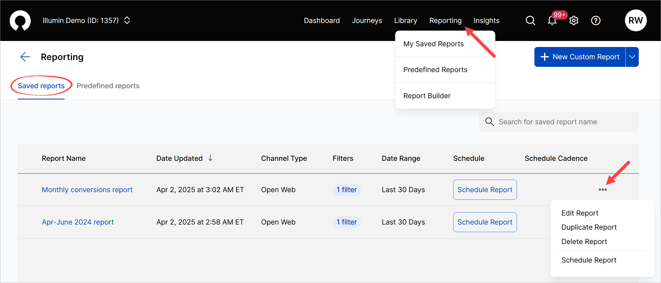 - Log in to your account, click Reports in the top menu, and select My Saved Reports.
