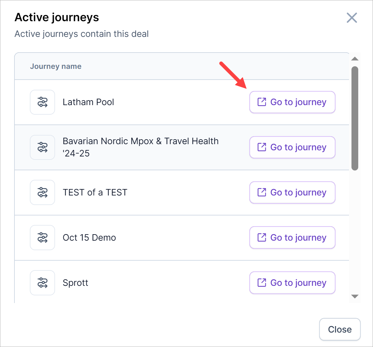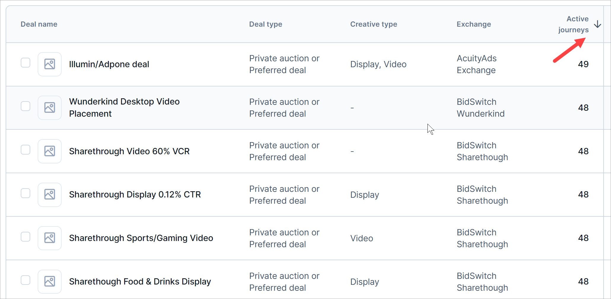 Go to a table column and click the arrow icon to change the sort order of deals. For instance, click the Active journeys arrow to quickly find deals with or without any associated active journeys.