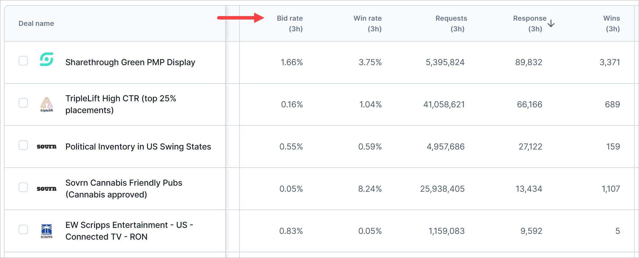 Performance data displays two time windows for each deal. Marketers review recent three-hour metrics and previous-day metrics to assess bid rate, win rate, requests, responses, and wins directly in the table.