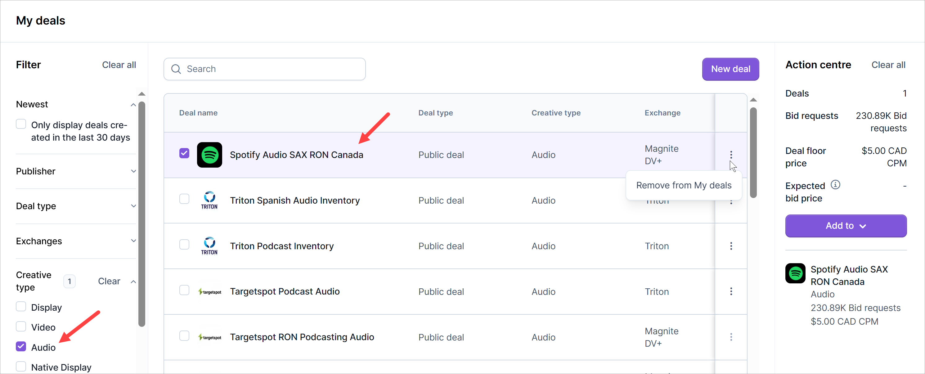 The My deals page helps marketers manage deals efficiently. It shows all public deals saved to the page, plus private deals and deals assigned to campaign tactics. Marketers can track real-time performance data and use tools to filter, sort, or remove deals.