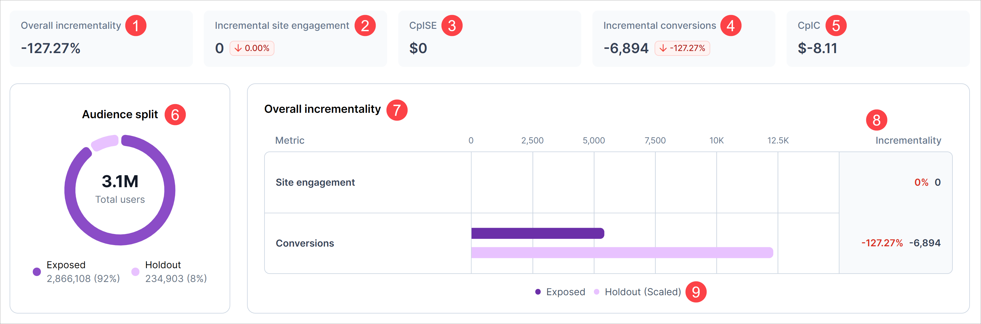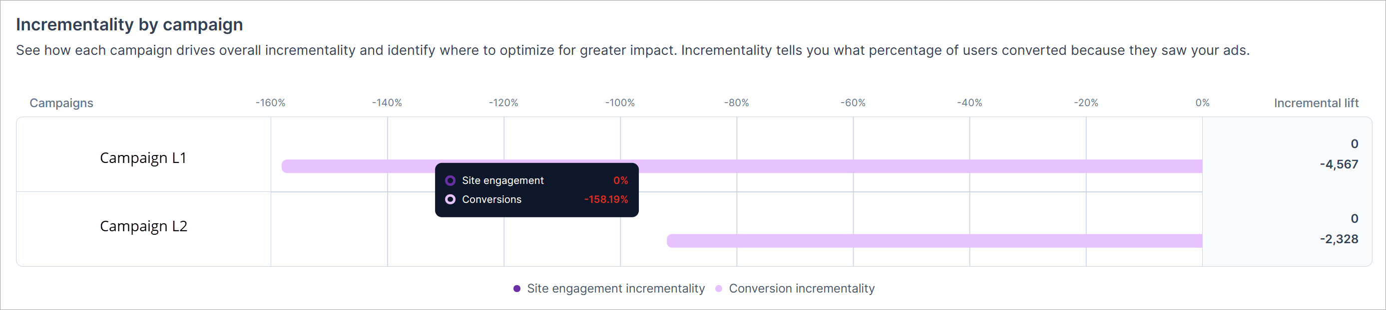 This chart shows incrementality rates for site engagements and conversions for each campaign in the experiment. It highlights how much site engagement or conversion rates differ between the exposed group (users served ads) and the holdout group (users not served ads). This information helps marketers identify campaigns that deliver real incremental value.