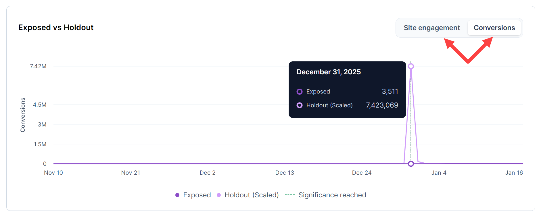 This chart shows how incrementality changes over time. The x-axis displays campaign flight dates, and the y-axis shows the volume of conversions or site engagements. Use the two buttons to switch between Site engagement and Conversion views.