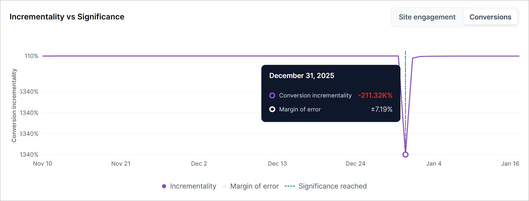 Hover a bar to view incrementality rates for site engagements and conversions at that point in time.