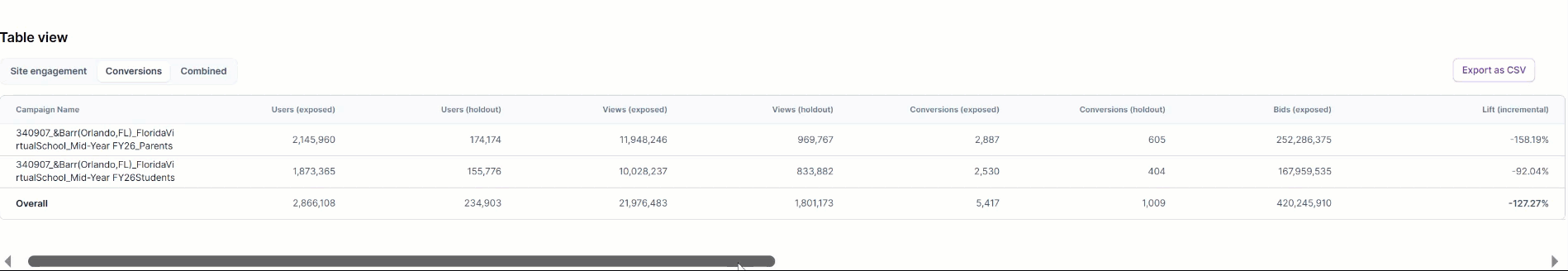 This table shows incremental volume for each campaign in the study. Use the buttons to switch the view from site engagement to conversions, and the combined numbers.