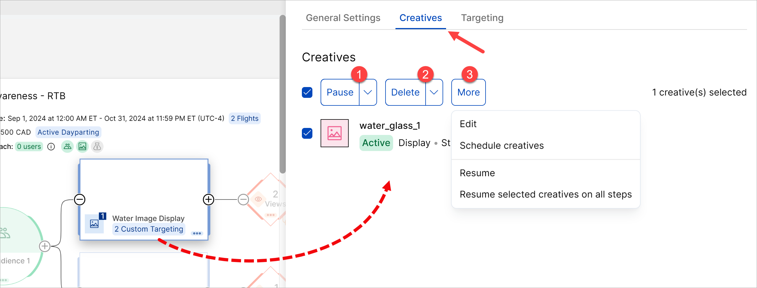- Resume selected creatives on all steps: Unpause all instances of the paused creative.