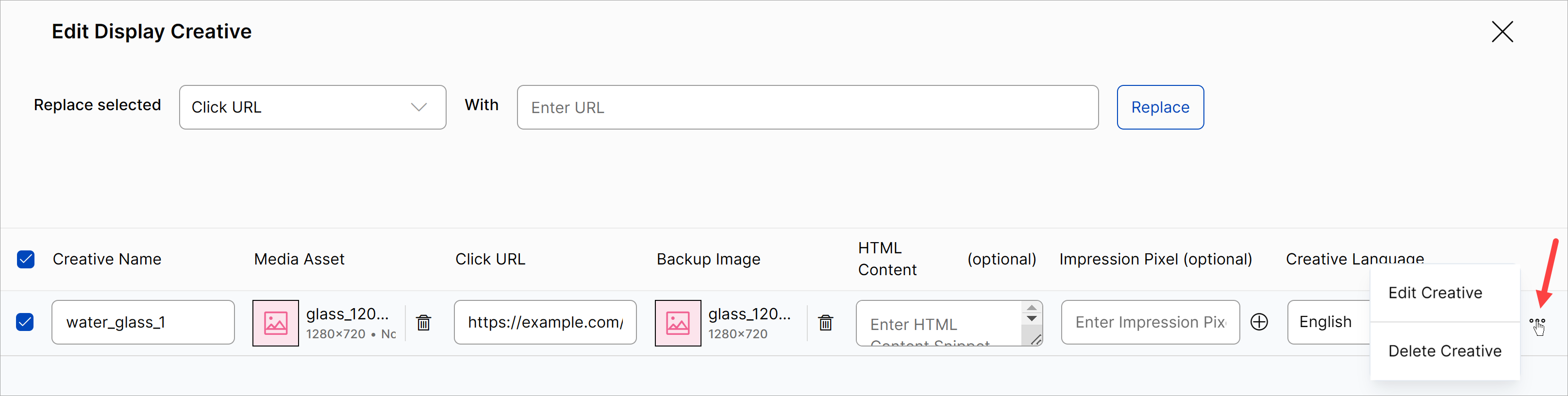 - Edit: Click to view and update file properties. You can edit the name of the creative file, change its URL, and more. Optionally, click the three-dot icon to open the editor in a side panel.