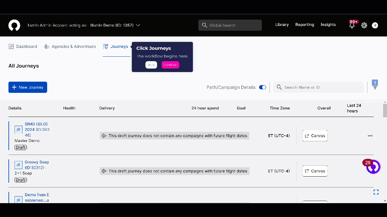 - Pause on all tactics: A bulk pause tool. illumin pauses all instances of the creative file across multiple tactics and campaigns within the same Classic canvas.