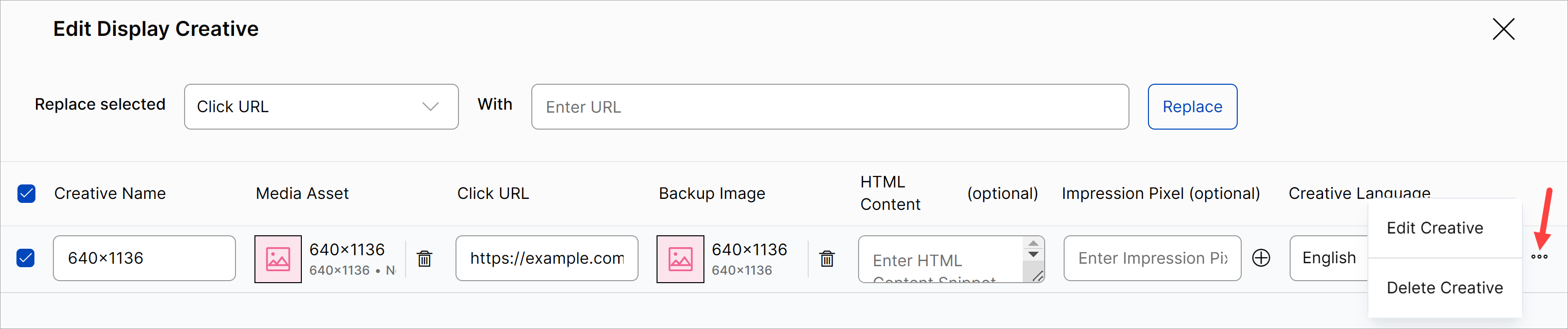 - Edit: Click to view and update file properties. You can edit the name of the creative file, change its URL, and more. Optionally, click the three-dot icon to open the editor in a new browser tab.