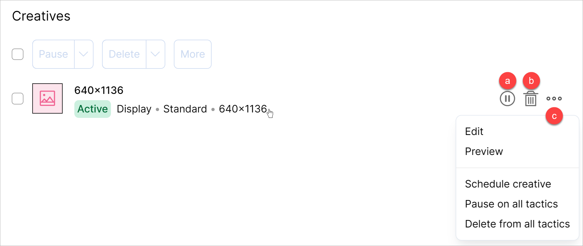 - Pause: Stop publishing the selected creative on the current tactic. Optionally, click the arrow icon to bulk pause the creative (i.e. pause all instances of the creative across all tactics and campaigns within this Classic canvas).