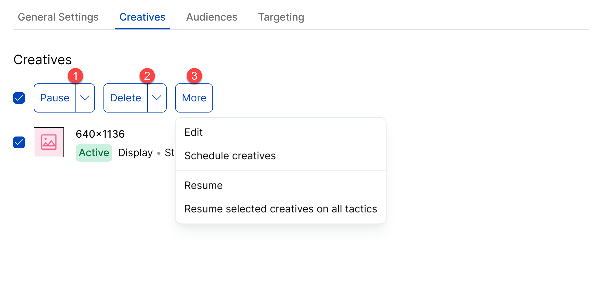 - Resume selected creatives on all tactics: Unpause all instances of the paused creative.