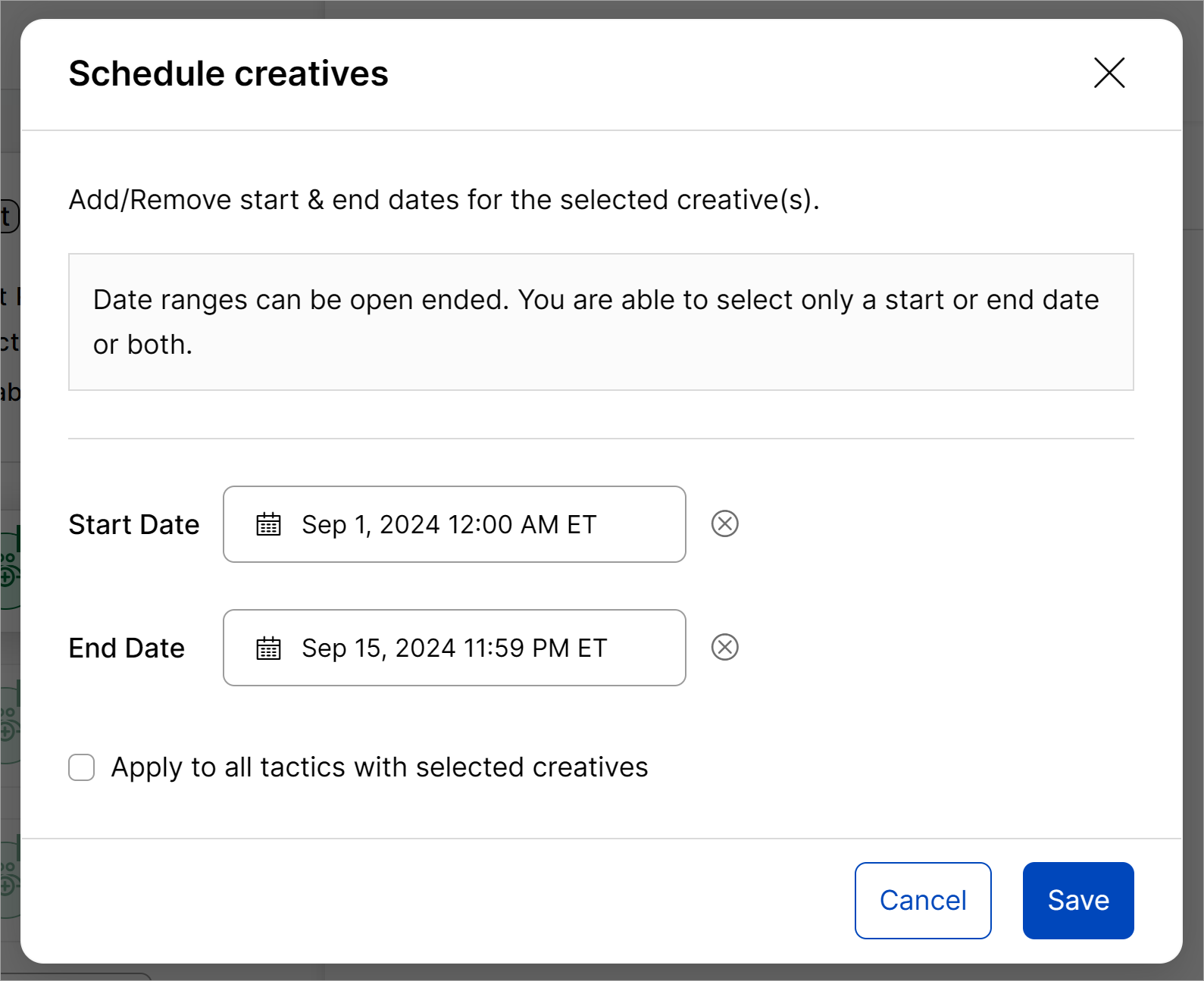 - Schedule creatives: Set custom start and end times if you want a creative schedule that's different from the campaign's flight range.