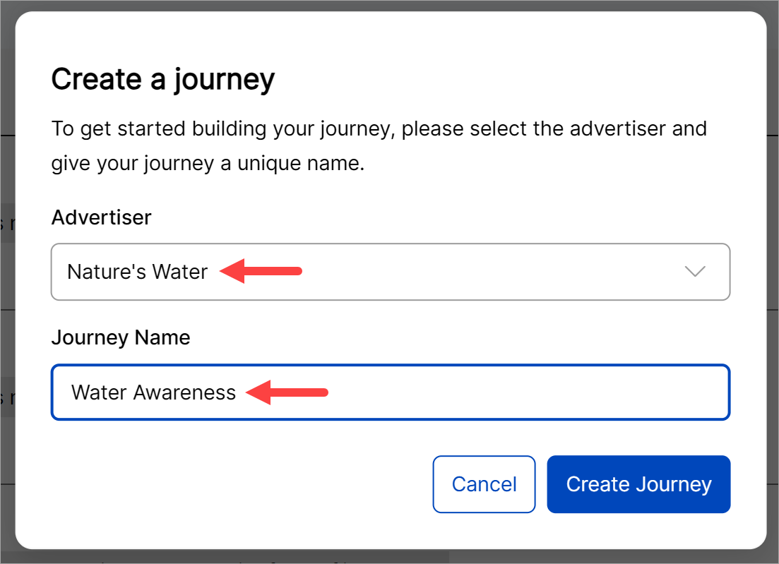 On the General Settings & Billing form, click the Advertiser field and select an advertiser. Enter a journey name (usually a brand). Click Create Journey.